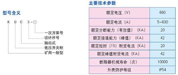 KDC3礦用一般型抽出式低壓開關(guān)柜適用于煤礦井下無瓦斯、煤塵爆炸危險場所或其它類似的工業(yè)生產(chǎn)部門,對額定電壓至660V、額定頻率作為50Hz的三相交流低壓配電系統(tǒng)中作為動力、配電、照明、電機(jī)及其它電氣設(shè)備的起動、控制和保護(hù)的開關(guān)設(shè)備及電源變換設(shè)備。